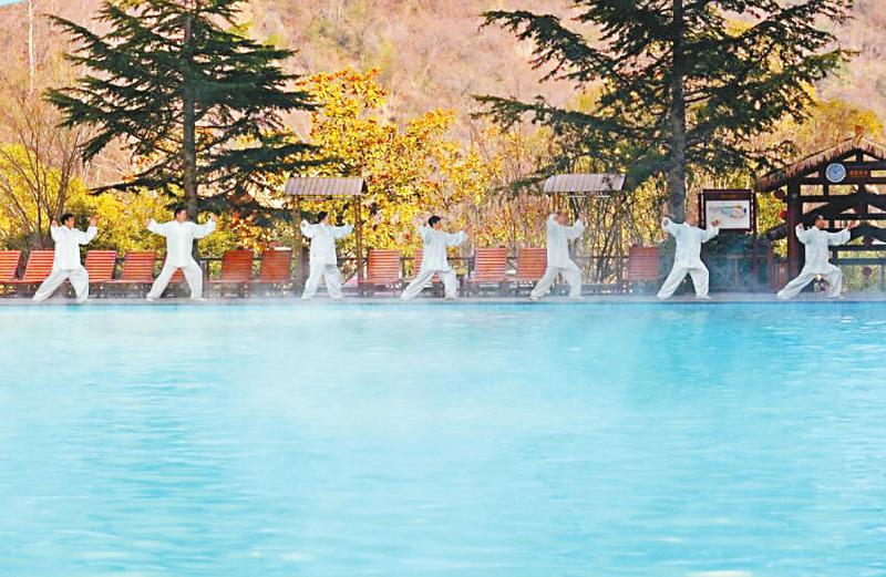 游客在天然温泉边做康养运动。