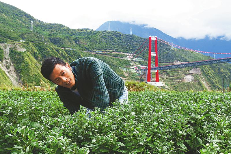 9月21日,泸定县泸桥镇伞岗坪水电移民安置点,团结村岔道组组长孟意浩正在给金丝黄菊搭架,在他的背后是网红桥——雅康高速泸定大渡河兴康特大桥,面前则是刚刚“露脸”的大片金丝黄菊。