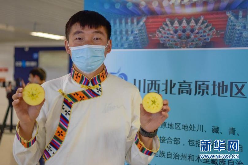 11月20日,在成都地铁1号线天府三街站“四川扶贫”产品展现场,小金县沃日镇乡村主播嘉绒阿斌推介当地出产的苹果。新华社记者 胥冰洁 摄