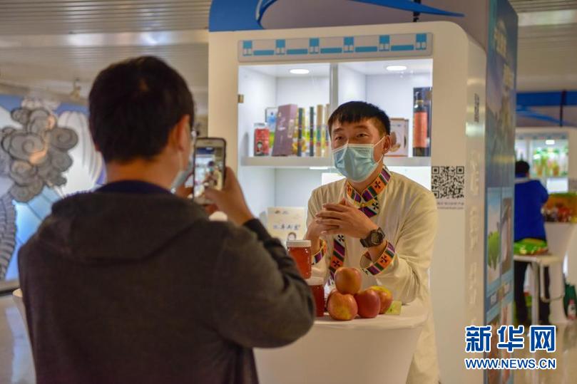 11月20日,在成都地铁1号线天府三街站“四川扶贫”产品展现场,小金县沃日镇乡村主播嘉绒阿斌在拍摄视频。新华社记者 胥冰洁 摄