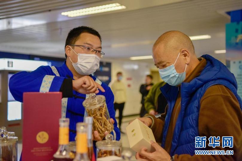 11月20日,在成都地铁1号线天府三街站“四川扶贫”产品展现场,达州市宣汉县龙泉土家族乡大坪村驻村第一书记屈德胜(左)在为市民介绍他带来的本地特产。新华社记者 胥冰洁 摄