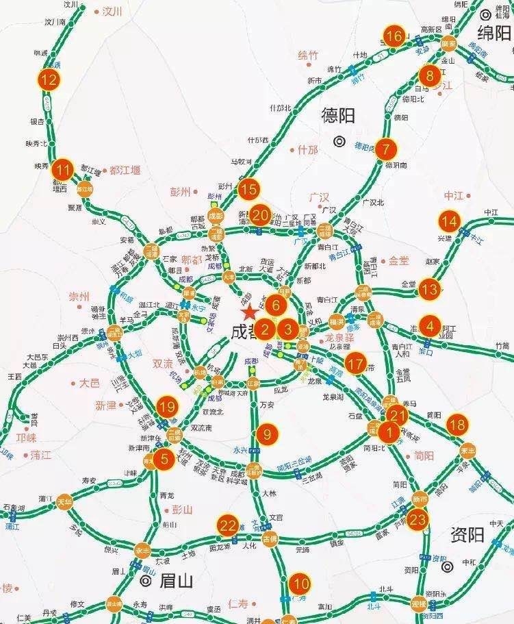 另外,SA2成都第二绕城高速、SA3成都第三绕高速作为成都市的环线高速,在出行高峰时段,各条放射线高速互通匝道处容易出现拥堵排行,请过往驾驶员提前减速,谨慎驾驶。