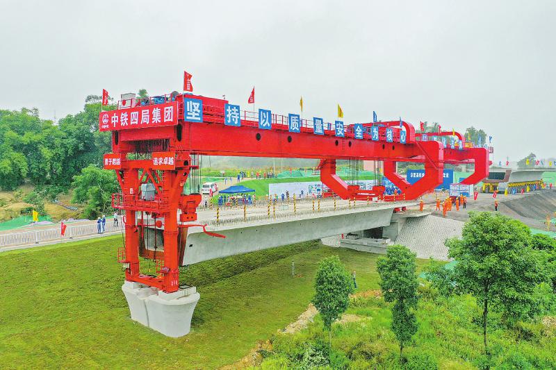 10月9日,一孔长32米、重820吨的箱梁稳稳落在泸州市江阳区境内的白云洞二号特大桥桥墩上。至此,渝昆高铁建设迎来一关键节点——全线首孔箱梁成功架设,从下部结构施工转入上部结构施工。