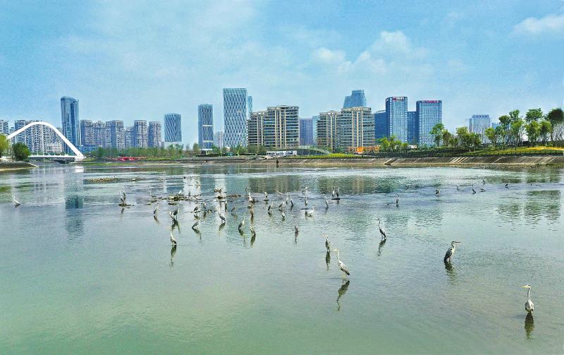4月2日,苍鹭在成都高新区府河段的河中栖息,成了都市中一道靓丽的风景线。