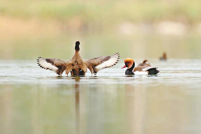 嬉戏中的赤嘴潜鸭,是国家三有保护动物。 摄于成都玉石湿地公园