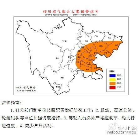 四川在线消息四川省气象局官方微博今(30)日发布消息,30日6时30分发布大雾橙色预警信号如下:预计今天早晨到上午,达州、南充、广安、遂宁、资阳、内江、自贡7市及绵阳、德阳、成都、眉山、乐山5市东部和宜宾、泸州2市北部有大雾,部分地方能见度将小于200米,局部地方小于50米。请公众注意大雾天气带来的不利影响,提醒司机朋友们留意道路交通信息。