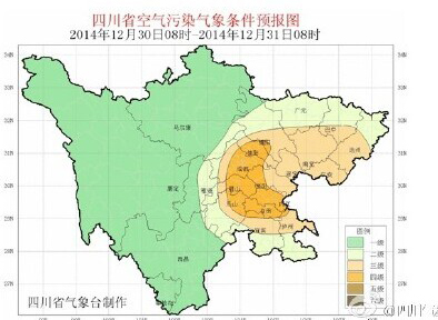 成都、绵阳、眉山、乐山、自贡、内江、资阳7市部分地方的气象条件不利于空气污染物稀释、扩散和清除,将出现中度污染天气,老年人应尽量减少晨练及外出!