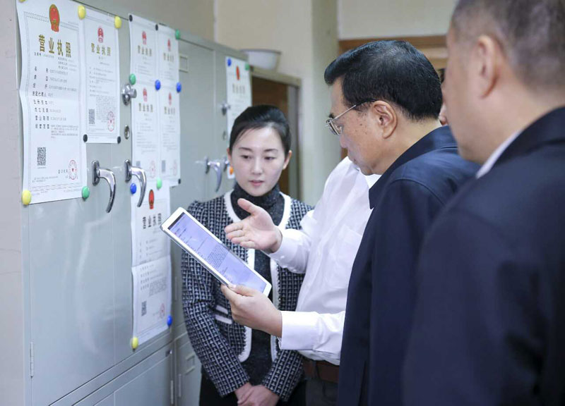 在企业注册局,李克强听取商事制度改革及新设企业特别是小微企业成长情况汇报。他说,工商部门站在简政放权、放管结合改革第一线,你们的工作为稳增长、促创新、扩就业发挥了重要作用。当前商事制度改革还在进行时,创业创新还有许多束缚,要持续发力,让市场活力和改革红利更加充分释放。
