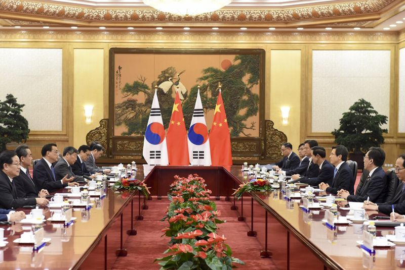李克强强调,维护东北亚和平稳定对本地区乃至世界都具有重要意义。中方愿同韩方及有关各方共同努力,致力于实现半岛无核化和地区发展与繁荣。双方应尊重彼此核心利益和重大关切,加强沟通与磋商,维护好中韩战略合作伙伴关系与互利合作大局。