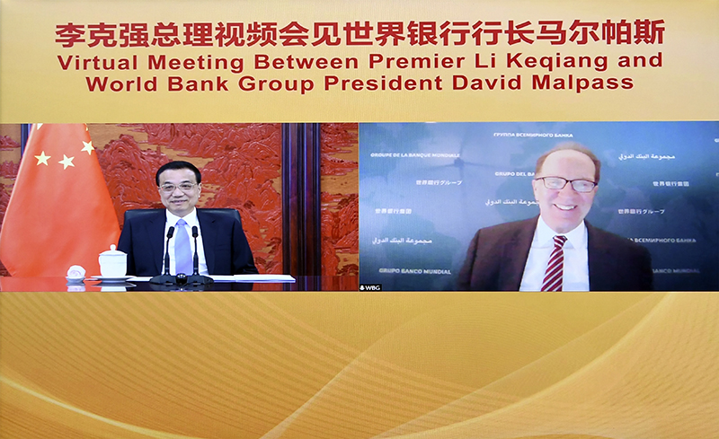 国务院总理李克强12月13日上午在中南海紫光阁视频会见世界银行行长马尔帕斯。