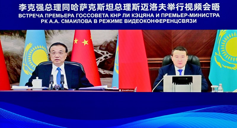 11月29日,国务院总理李克强在北京人民大会堂以视频方式同哈萨克斯坦总理斯迈洛夫举行中哈总理会晤。新华社记者 岳月伟 摄