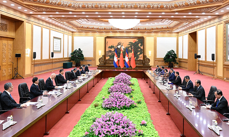 习近平指出,中柬建交65年来,两国相互尊重、相互信任、相互支持、相互成就,树立了大小国家平等相待、互利双赢的典范。中柬都是重情义的国家,中柬铁杆友谊牢不可破。双方要常来常往,保持高层战略沟通,用好两国政府间协调委员会机制,落实好构建新时代中柬命运共同体行动计划,推动中柬关系好上加好。