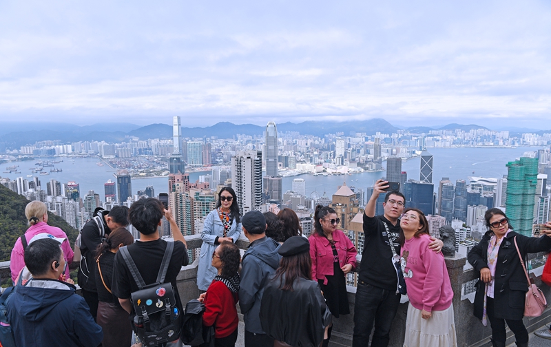 连日来,太平山顶、中环摩天轮、尖沙咀海港城和铜锣湾等旅游景点及商圈游人如织,不少游客在红色的节庆装置旁拍照留念,全城喜气洋洋。