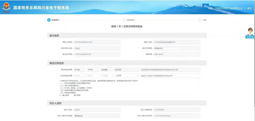 19日,特云宝网络科技有限公司办税人员通过电子税务局成功办理从四川省泸州市龙马潭区迁往重庆市九龙坡区的业务,这也是首笔线上川渝跨省迁移业务。他说:“本来做好了四川重庆来回跑的准备,没想到现在网上秒办理,真是太省心了。”