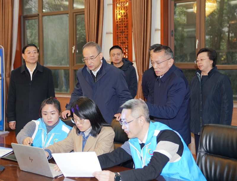 1月5日,省委副书记、省长黄强在峨眉电影集团认真察看现场登记和数据录入情况,询问了解数据采集处理系统、移动小程序等信息技术应用情况。