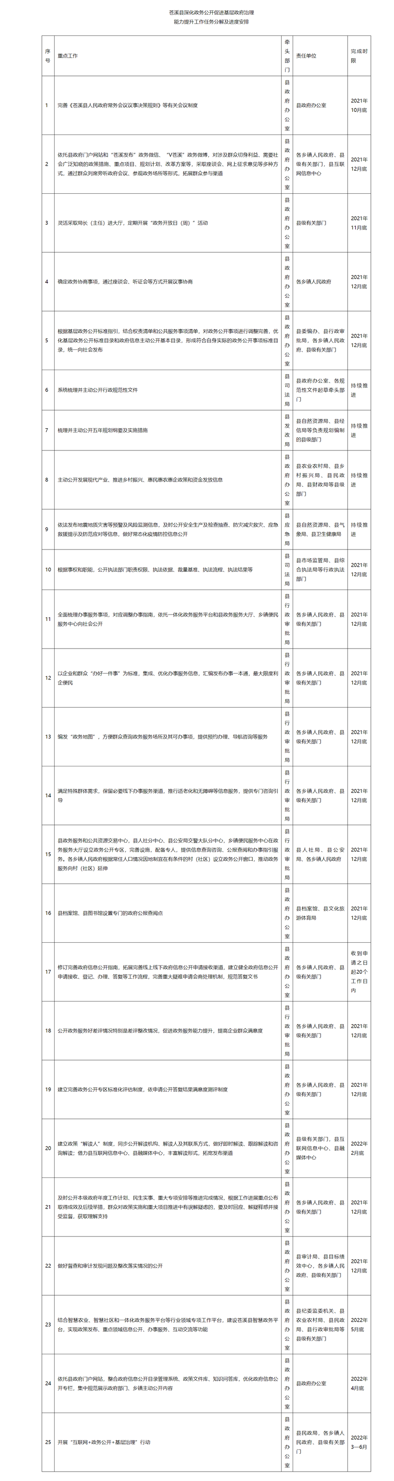 2.2022年5月底前对全县深化政务公开促进基层政府治理能力提升工作情况进行全面评估,6月底前整改完成。