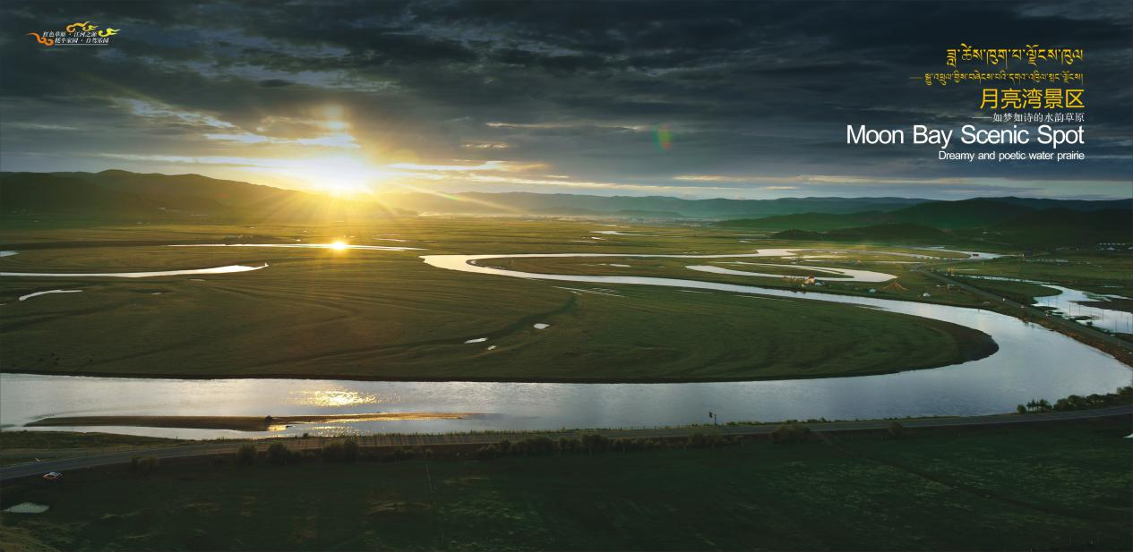 嘎曲河蜿蜒九曲穿越景区,美丽宽广的草原就像块柔软的绿色地毯铺在梦幻的大地上,清澈的河水在草原上划出一道道舒缓优美的弧线,恰似一轮轮新月,“月亮湾”也因此得名。它以其静美闻名于世,是川西北大草原的一颗旅游明珠。拥有迷人的草原风光、藏乡风情,夕阳下的月亮湾,金光点点,千转百回,其缠绵悱恻的动人传说更为其增添了浪漫的人文色彩。湿地草原、蜿蜒河流、帐房牛羊、野鹤草鹿以及如梦如幻的美景让这里成了自驾游客的天堂。