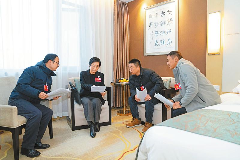 1月18日,邱源代表(左一)、李秀英代表(左二)、唐义勇代表(右二)与黄吉彬代表(右一)在驻地讨论完善相关建议。 记者 李强 摄