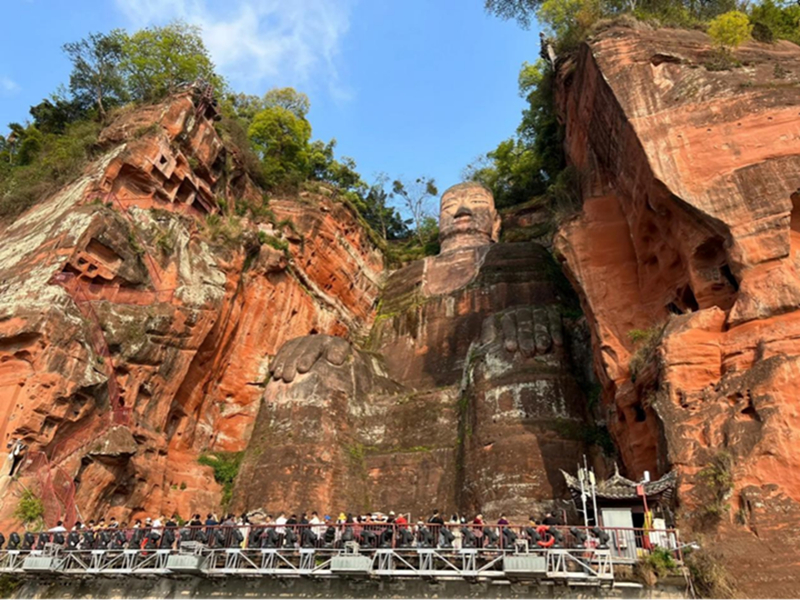 乐山大佛位于峨眉山东麓的栖鸾峰,古称“弥勒大像”、“嘉定大佛”,始凿于唐代开元初年(公元713年),历时90年才得以完成。佛像依山临江开凿而成,是世界现存最大的一尊摩崖石像,有“山是一尊佛,佛是一座山”的称誉。大佛为弥勒倚坐像,坐东向西,面相端庄,通高71米。雕刻细致,线条流畅,身躯比例匀称,气势恢宏,体现了盛唐文化的宏大气派。佛座南北的两壁上,还有唐代石刻造像9O余龛。