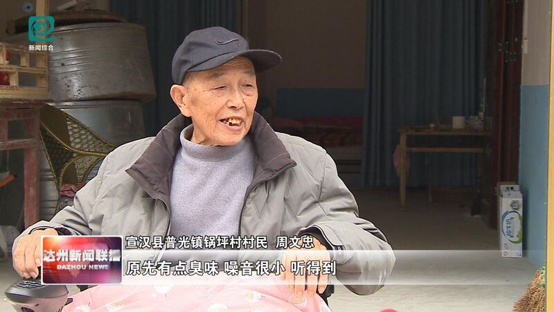 宣汉县普光镇锅坪村村民 周文忠:原先有点臭味,噪音很小,听得到,最后这一段时间噪音也听不到了,没得了,臭味也没得了。