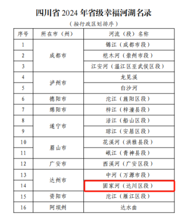 近日,四川省水利厅正式公布2024年省级幸福河湖名录,锦江(成都市段)、桤木河(崇州市段)等16条河流(段)被评定为省级幸福河湖。固家河(达川区段)榜上有名。