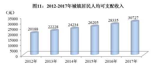 按常住地分,全年城镇居民人均可支配收入30727元,比上年增长8.4%。其中,工资性收入17299元,增长6.7%;经营净收入3586元,增长7.8%;财产净收入2627元,增长11.1%;转移净收入7215元,增长12.3%。人均消费性支出21991元,增长6.4%。其中,居住支出增长4.0%,生活用品及服务支出增长7.1%,交通通信支出增长18.6%。城镇居民恩格尔系数33.3%。