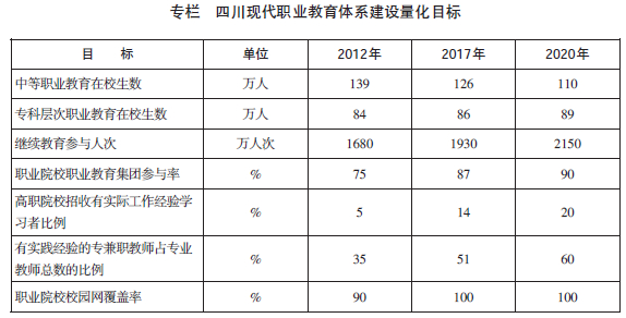 ——2020年,以“优化结构,提高质量,特色发展,突出效益”为重点,基本建成适应经济转型升级的四川现代职业教育体系。职业教育体系的层次、结构和布局更加科学,技术技能人才的供需结合更加紧密,行业企业和职业院校共同推进的技术技能积累创新机制基本