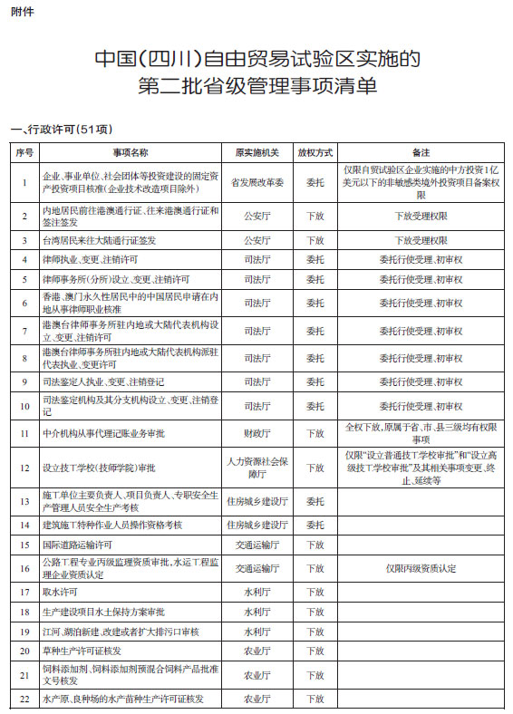 附件:中国(四川)自由贸易试验区实施的第二批省级管理事项清单