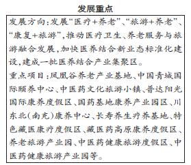 (八)推进医疗卫生、养老服务与旅游融合发展。依托优质旅游资源和道地中药材种植基地,强化医疗卫生与养老、康养、旅游等产业结合,促进产业融合发展,培育一批康养旅游产业集聚区、康养旅游示范区,建设一批精品康养旅游项目,推出一批以度假型养老、疗养康复、森林康养、抗衰老等为主题的康养旅游产品。鼓励有条件的医疗机构在风景旅游区设置连锁门诊部,开展医疗与养生保健服务。鼓励中医养生保健机构与风景旅游区或酒店合作,提供中医养生保健服务。结合区域医疗资源,推出中医针灸、推拿、理疗相结合的特色旅游线路和服务项目,打造特色医疗、慢性病防治、疗养康复、美容保健、中医药养生、中医药疗养康复等健康旅游品牌产品。加强旅游市场宣传推广,将健康旅游特色产品纳入旅游项目推广计划。创新服务模式,推进医疗保健、中医药健康服务等多种方法综合干预,鼓励发展特色医疗康复保健、中医药健康旅游项目,推出中医药健康旅游主题线路,提高休闲旅游对老年人的吸引力。