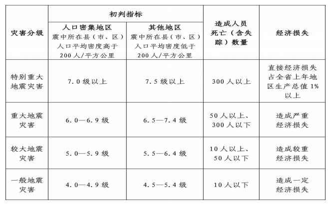 初判指标:人口密集地区发生7.0级以上地震,或其他地区发生7.5级以上地震。