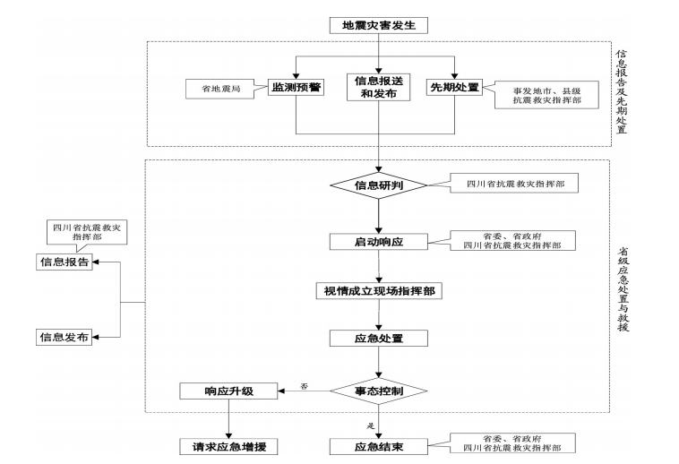 发生特别重大和重大地震灾害,由省政府负责应对。发生较大和一般地震灾害,分别由事发地市(州)和县(市、区)人民政府负责应对。当地震灾害超出所在县(市、区)、市(州)人民政府应对能力时,由上一级人民政府提供支援或者负责应对。