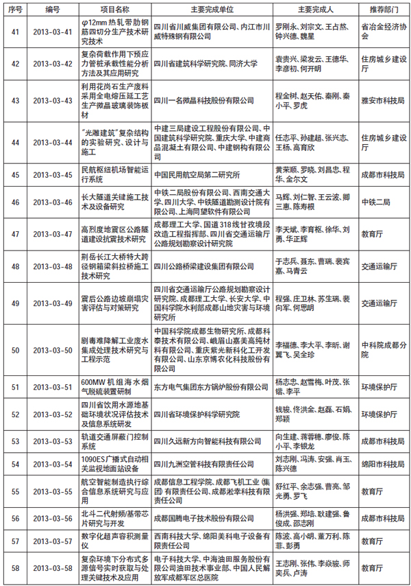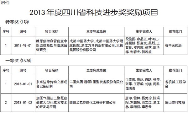 各市(州)人民政府,省政府各部门、各直属机构: 为深入贯彻党的十八大和十八届三中全会精神,大力实施创新驱动发展战略,推动科学技术进步,增强转型发展、跨越提升新动力,根据《四川省科学技术奖励办法》,经省科学技术进步奖评审委员会严格评审,省政府决定授予“糖尿病微血管病变中医证效基础与临床循证研究”四川省科技进步奖特等奖,授予“多点边缘传动立磨成套设备研制”等35项成果四川省科技进步奖一等奖,授予“沙特拉比格835MVA/60Hz汽轮发电机研制”等58项成果四川省科技进步奖二等奖,授予“大中型船用柴油机曲轴制造工艺开发”等153项成果四川省科技进步奖三等奖。 希望全省科技工作者以获奖者为榜样,继续发扬求真务实、团结协作、勇于创新精神,提高自主创新能力,推动科技成果转化,促进科技与经济紧密结合,为我省科学发展、加快发展和全面建成小康社会作出新的更大贡献。