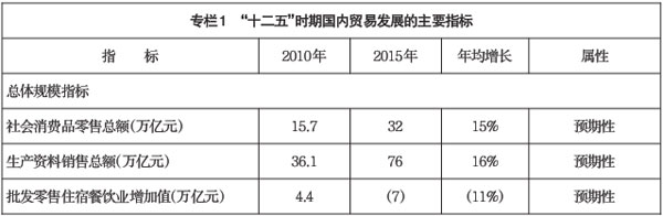 总体规模指标实现翻番。2015年社会消费品零售总额32万亿元左右,年均增长15%左右;生产资料销售总额76万亿元左右,年均增长16%左右;批发零售住宿餐饮业增加值超过7万亿元,年均实际增长11%左右。2015年国内贸易就业人数1.3亿人左右,其中城镇就业1亿人左右,年均增加500万人以上。
