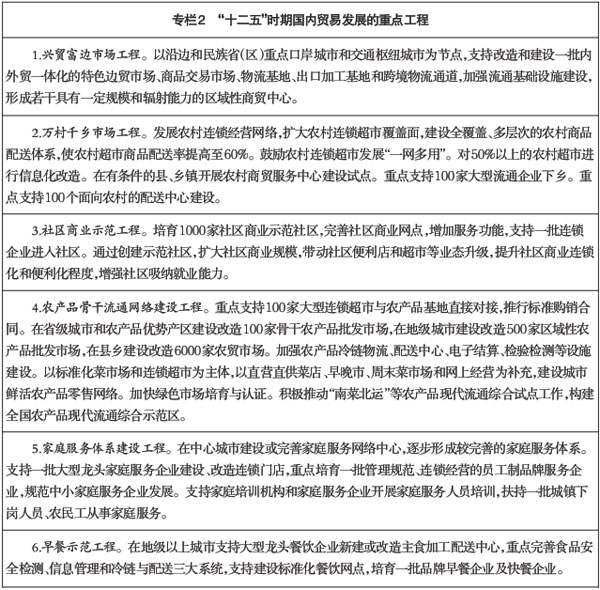 《国内贸易发展“十二五”规划》根据《中华人民共和国国民经济和社会发展第十二个五年规划纲要》编制,主要阐明“十二五”时期我国国内贸易发展战略,提出发展政策导向,明确政府工作重点,引导市场主体行为,促进国内贸易又好又快发展。