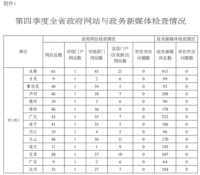 下半年检查评估,对象为21个市(州)和39个省直部门政府网站。结果显示,巴中市、宜宾市、南充市、广安市、凉山州、内江市政府门户网站及生态环境厅、交通运输厅、住房城乡建设厅、自然资源厅、省市场监管局、财政厅、教育厅等省直部门网站建设情况良好。