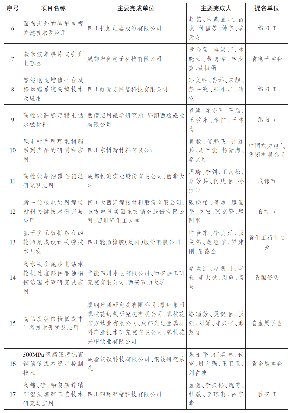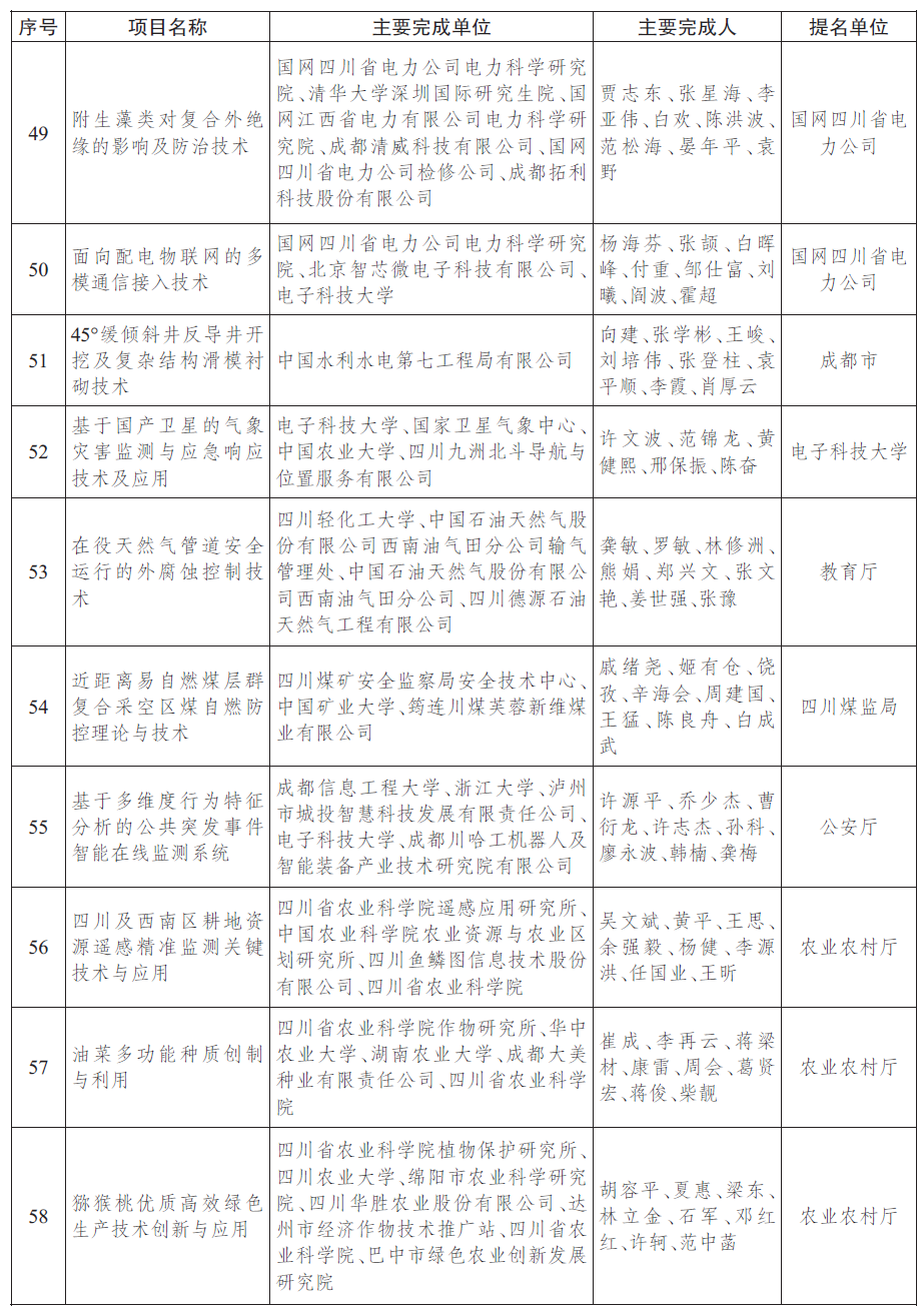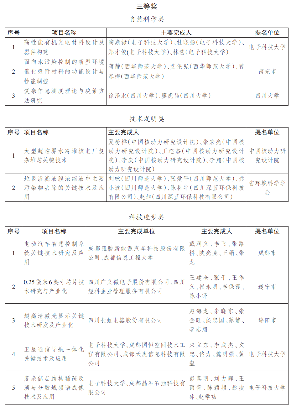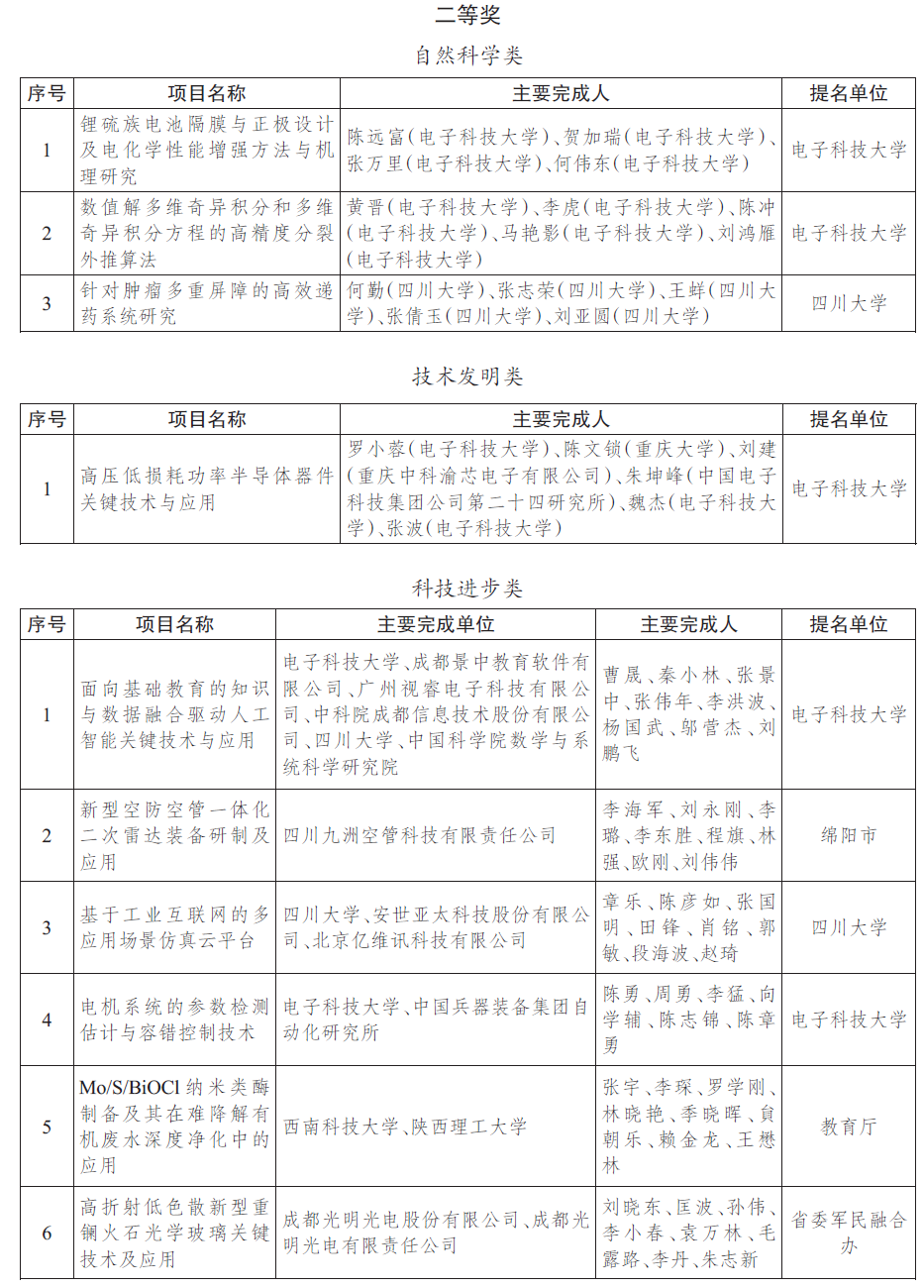 根据《四川省科学技术奖励办法》,经省科学技术奖励评审委员会评审、省科学技术奖励委员会审定,省政府批准授予四川大学冯小明教授四川省科学技术杰出贡献奖;授予“微纳结构化智能高分子材料的可控构建与性能强化机制”等36项成果四川省科学技术进步奖一等奖,授予“锂硫族电池隔膜与正极设计及电化学性能增强方法与机理研究”等80项成果四川省科学技术进步奖二等奖,授予“高性能有机光电材料设计及器件构建”等147项成果四川省科学技术进步奖三等奖;授予马丁·毕比(MartinBeeby)、特奥尔多·乌特鲁斯·约翰内斯·冯·阿什(TheodoorWouterusJohannesvanAsch)国际科技合作类奖。