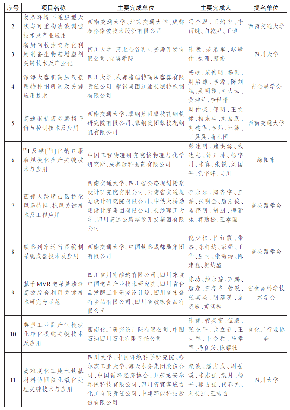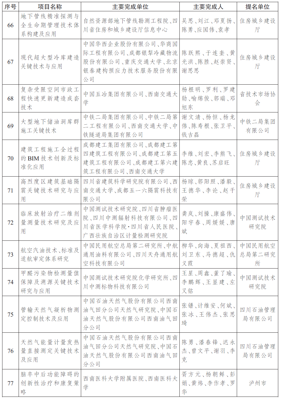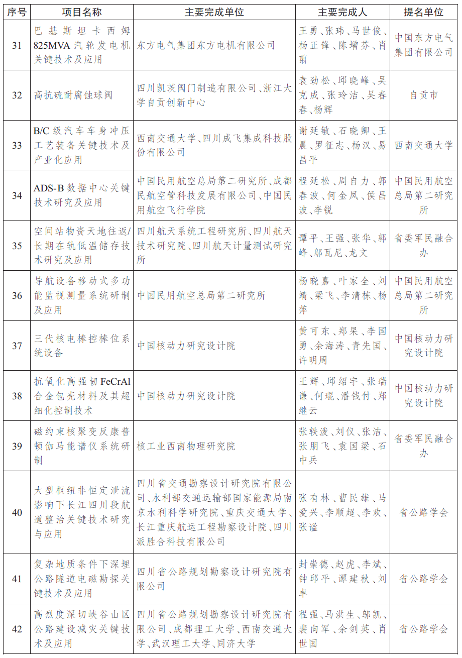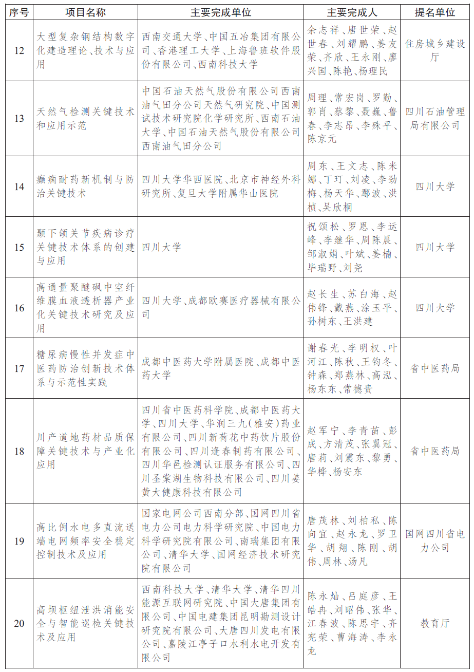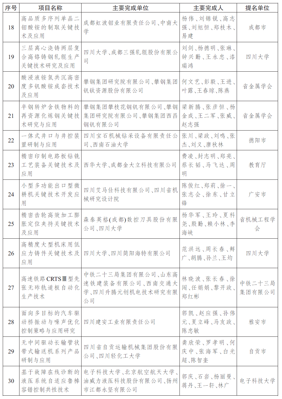 根据《四川省科学技术奖励办法》,经省科学技术奖励评审委员会评审、省科学技术奖励委员会审定,省政府批准授予四川大学冯小明教授四川省科学技术杰出贡献奖;授予“微纳结构化智能高分子材料的可控构建与性能强化机制”等36项成果四川省科学技术进步奖一等奖,授予“锂硫族电池隔膜与正极设计及电化学性能增强方法与机理研究”等80项成果四川省科学技术进步奖二等奖,授予“高性能有机光电材料设计及器件构建”等147项成果四川省科学技术进步奖三等奖;授予马丁·毕比(MartinBeeby)、特奥尔多·乌特鲁斯·约翰内斯·冯·阿什(TheodoorWouterusJohannesvanAsch)国际科技合作类奖。