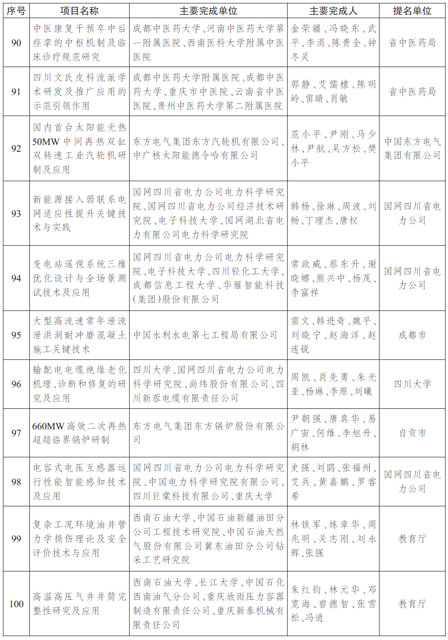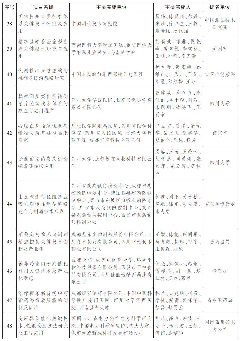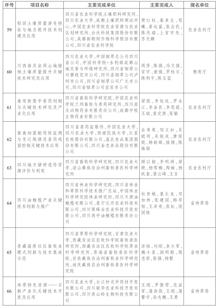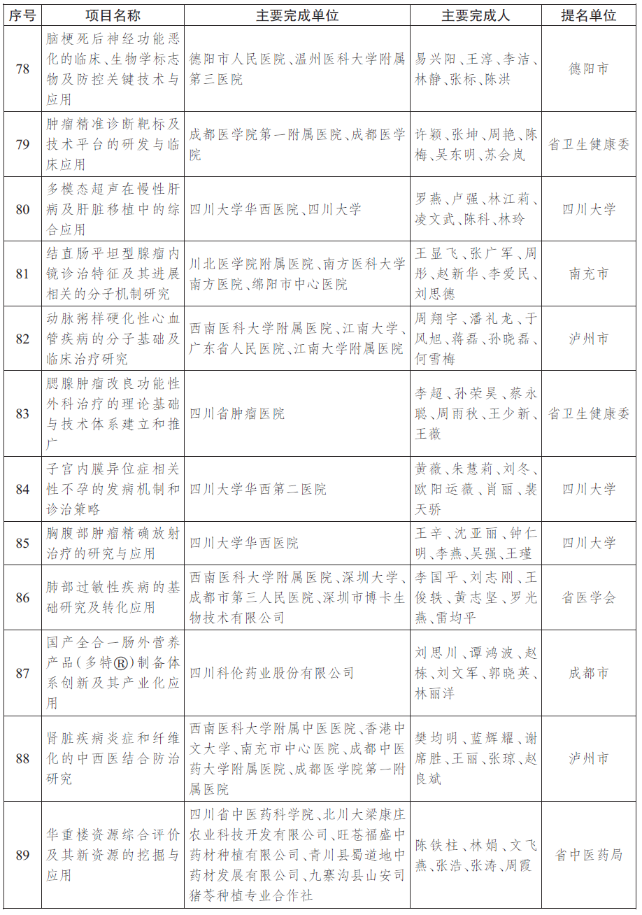根据《四川省科学技术奖励办法》,经省科学技术奖励评审委员会评审、省科学技术奖励委员会审定,省政府批准授予四川大学冯小明教授四川省科学技术杰出贡献奖;授予“微纳结构化智能高分子材料的可控构建与性能强化机制”等36项成果四川省科学技术进步奖一等奖,授予“锂硫族电池隔膜与正极设计及电化学性能增强方法与机理研究”等80项成果四川省科学技术进步奖二等奖,授予“高性能有机光电材料设计及器件构建”等147项成果四川省科学技术进步奖三等奖;授予马丁·毕比(MartinBeeby)、特奥尔多·乌特鲁斯·约翰内斯·冯·阿什(TheodoorWouterusJohannesvanAsch)国际科技合作类奖。