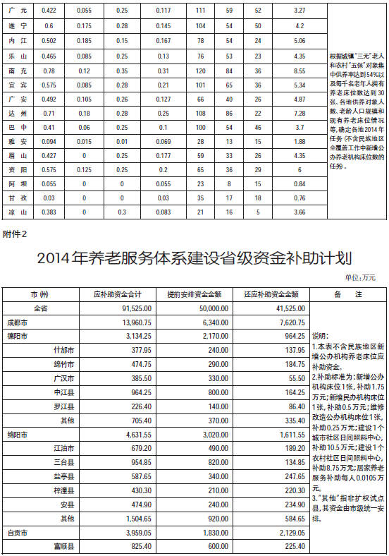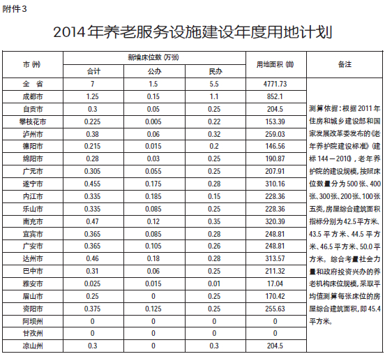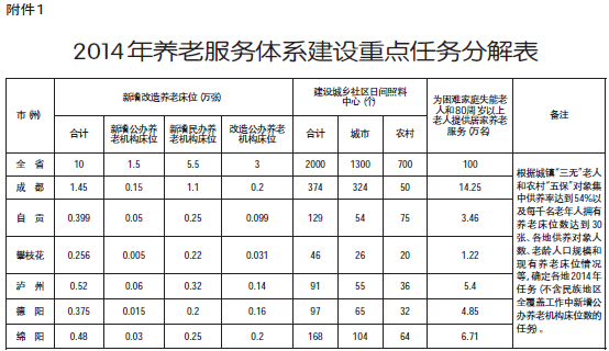 根据《四川省人民政府办公厅关于印发四川省“十二五”社会养老服务体系建设规划的通知》(川办发〔2012〕43号)确定的主要目标,结合我省社会养老服务体系和财政状况实际,2014年的重点建设任务是: