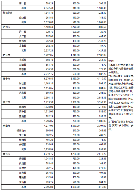 (一)对公办机构新增床位每张政府平均投资不低于3.5万元、民办机构新增床位每张政府资金补助平均不低于1万元、维修改造公办养老机构床位每张补助0.5万元,三个项目省级财政按最低标准的50%给予补助,不足部分由市、县统筹安排。