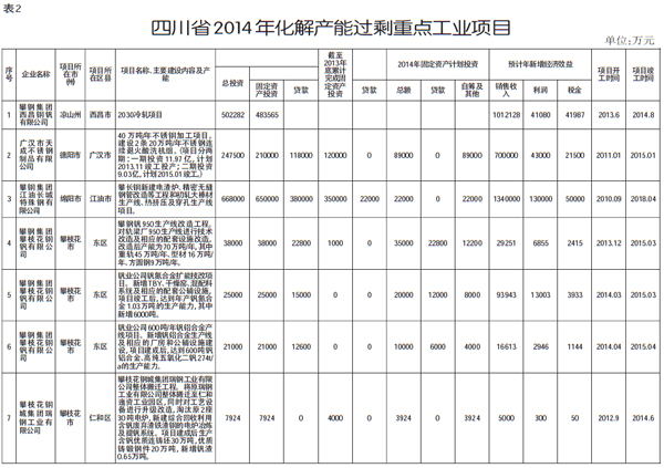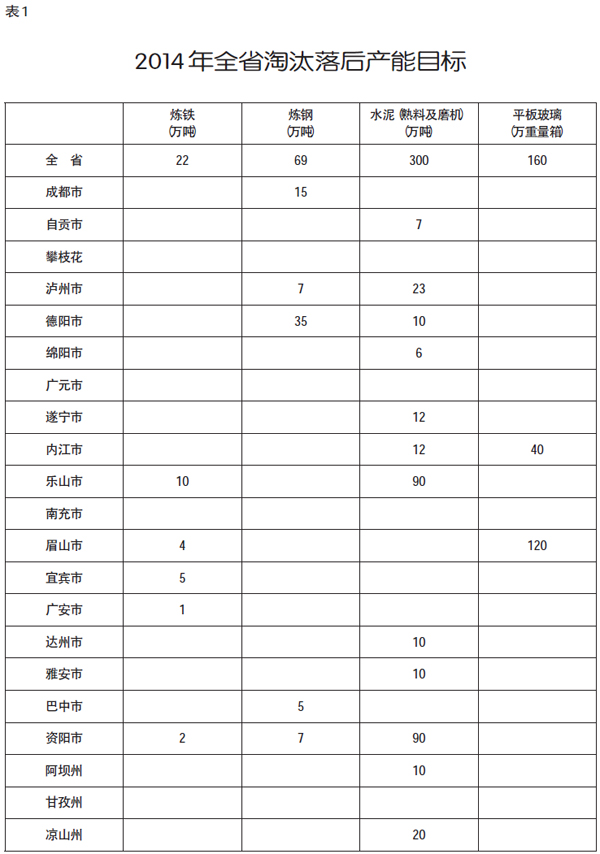 2014年全省淘汰落后产能目标详见表1,四川省2014年化解产能过剩重点工业项目详见表2。