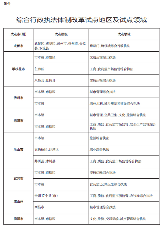 经中央编办批准,我省成都、攀枝花、泸州、绵阳、乐山、宜宾、凉山等7个市(州)为全国综合行政执法体制改革试点地区;同时,确定德阳市为省级综合行政执法体制改革试点地区(具体试点层级及领域详见附件)。其他市(州)可结合当地实际开展改革试点工作,并将所确定的试点层级和领域报省综合行政执法体制改革试点工作指导小组备案。